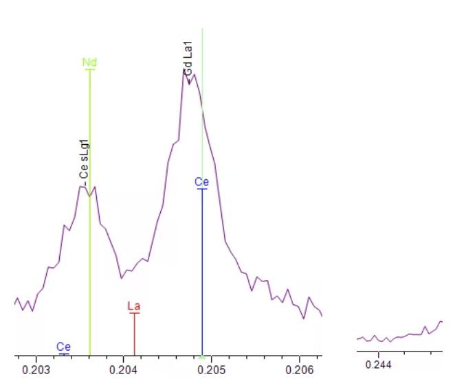 由于稀土線系繁雜,不同元素之間的特征能量(特征波長)非常鄰近,元素之間相互干擾非常嚴(yán)重的。下圖可以看到, Gd Lα和Ce Lγ,以及Pr Lα和 La Lβ幾乎完全重疊,故而無法使用常規(guī)的方法和默認(rèn)的參數(shù)進(jìn)行測試。