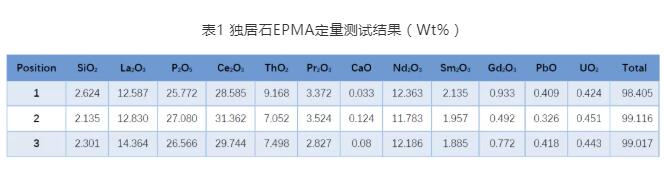 主量元素可選擇獨(dú)居石標(biāo)樣,U、Th、Pb三元素推薦使用金屬U、金屬Th和PbS等標(biāo)樣。其他參數(shù)可根據(jù)試樣和儀器情況實(shí)驗(yàn)研究,以確認(rèn)更好的測試參數(shù)。下表為某地采集的獨(dú)居石試樣,電子探針測試獲得的微區(qū)定量結(jié)果。