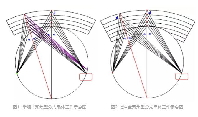 圖1為常規(guī)的半聚焦分光晶體工作示意圖,如果需要高靈敏度時,需要把特征X 射線檢測器前端的狹縫調(diào)大,但必然會造成分辨率的變差; 反之,需要高分辨率時,則要把檢測器狹縫縮窄,但又會造成靈敏度的下降;顯然在面對分辨率和靈敏度的兩難抉擇時,半聚焦分光晶體自是顧此失彼、捉襟見肘。而島津全聚焦分光晶體(圖2),則兼顧了靈敏度與分辨率。