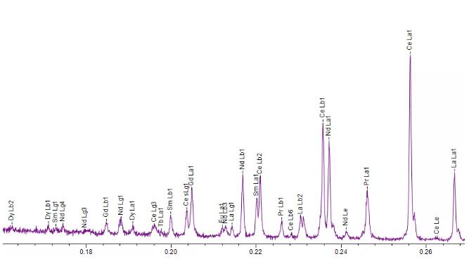 正如共生的稀土資源不易分離,稀土元素特征X射線信號之間也是重疊嚴重、彼此干擾。表現(xiàn)在特征X射線的譜圖上,就是密密麻麻的特征譜線彼此緊鄰。如果要把這些譜線區(qū)分開來,儀器必須具有良好的分辨率。此外,除主量元素外,稀土礦通常也含有多種低含量的共生稀土元素,這對測試儀器的檢測靈敏度也是極大的考驗。