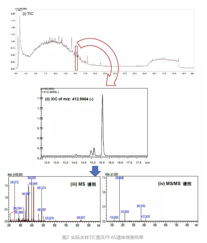 將地表水樣品濃縮50倍后直接進(jìn)樣分析,利用質(zhì)譜庫(kù)匹配保留時(shí)間、MS、MS/MS圖譜,在其中篩查到了PFOA,MS和MS/MS質(zhì)譜的相似度分別為96%和92%,質(zhì)量誤差0.18ppm(圖2)。