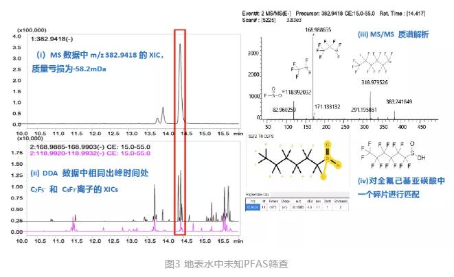 利用質(zhì)量虧損過(guò)濾和特征碎片離子進(jìn)一步篩查,發(fā)現(xiàn)(-)m/z 382.94179可能是一個(gè)未知PFAS:(i)匹配的質(zhì)量虧損(-58.2 mDa),(ii)發(fā)現(xiàn)了C2F5-和C3F7-。采用分子式預(yù)測(cè)軟件,得到了高度匹配的分子式C6F13SO2H,質(zhì)量誤差為+0.26 ppm,與MS/MS質(zhì)譜中的碎片與C6F13-和FSO2-相匹配,推測(cè)該P(yáng)FAS可能是全氟己基亞磺酸或其類似物(圖3)。