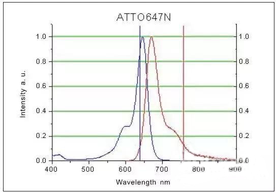 這大概是絕大多數(shù)電子的選擇。跳下來的時(shí)候它們會(huì)降落在S0能級(jí)的不同高處,并形成—定的分布。這個(gè)分布我們可以用發(fā)射光譜來描述其統(tǒng)計(jì)特性,如下圖某染料ATTO 647N的激發(fā)光譜(藍(lán)色曲線)與發(fā)射光譜(紅色曲線)??梢?,粒子輻射躍遷從620-850 nm均有可能,在670 nm處幾率最大。