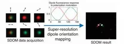 我們前面講述了STED是在空間維度將不同的點(diǎn)區(qū)分開,PLAM/STORM是在時(shí)間維度將不同的點(diǎn)分開。這也就啟發(fā)科學(xué)家們?nèi)ニ伎寄芊裨谄渌S度將距離很近的兩個(gè)點(diǎn)分開?2016年10月,北京大學(xué)席鵬課題組提出SDOM(Super-resolution Dipole Orientation Mapping microscopy)技術(shù),將兩個(gè)距離很近的點(diǎn)在偏振維度分開從而實(shí)現(xiàn)了超分辨,該工作也得到了Nature Methods的亮點(diǎn)報(bào)道。