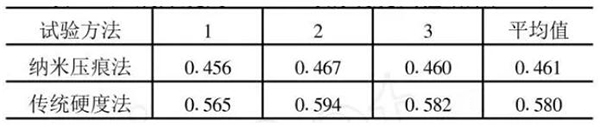 本試驗中對單晶鋁(110)面進行檢測,設置壓痕深度為1.5μm,共測量三點,最終結果取三點的平均值。下圖為最大壓痕深度1.5μm時的試驗結果,其中納米硬度平均值為0.46GPa,而用傳統硬度計算方法得到的硬度平均值為0.580GPa,這說明傳統硬度計算方法在微納米硬度測量時誤差較大,其原因就是在微納米硬度測量時,材料變形的彈性恢復造成殘余壓痕面積較小,傳統方法使得計算結果產生了偏差,不能正確反映材料的硬度值。