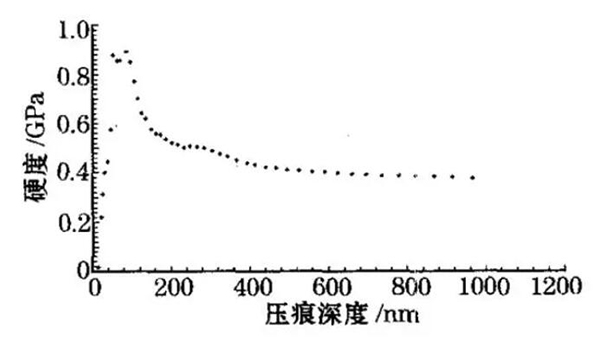 通過對不同載荷下的納米硬度測量值進行比較發現,單晶鋁的納米硬度值并不是恒定的, 而是在一定范圍內隨著載荷(壓頭位移)的降低而逐漸增大,也就是存在壓痕尺寸效應現象。