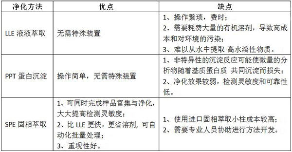 作為比較,固相萃取和傳統的液液萃取法和蛋白沉淀法具有各自的特點。