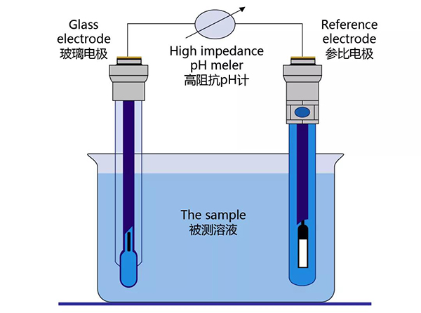 建立一個對所測量溶液的氫離子活度發生變化作出反應的電位差。把對pH敏感的電極和參比電極放在同一溶液中,就組成一個原電池,該電池的電位是玻璃電極和參比電極電位的代數和。E電池=E參比+E玻璃,如果溫度恒定,這個電池的電位隨待測溶液的pH變化而變化,而測量pH計中的電池產生的電位是困難的,因其電動勢非常小,且電路的阻抗又非常大1-100MΩ;因此,必須把信號放大,使其足以推動標準毫伏表或毫安表。