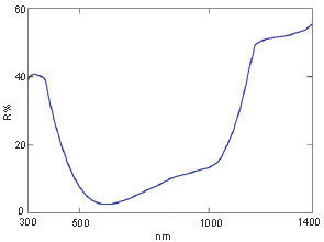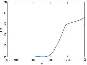 此圖是多晶硅樣品的透過率譜圖,由于系統(tǒng)具有測定到1400nm的能力,顯示了帶隙區(qū)域(1000nm附近)的透過率特征。