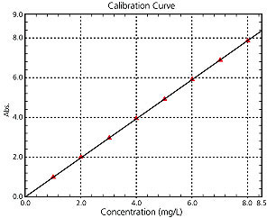 UV-2700i實現(xiàn)了低雜散光,擴展測定范圍至8Abs,透過率0.000001%。除了測定高濃度樣品不需要稀釋外,此系統(tǒng)還能用于評價偏振膜的透過率性能。高錳酸鉀溶液濃度和吸光度的線性曲線。直到8Abs都有好的線性。