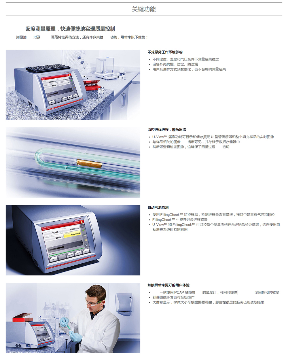 DMA 4100 M 可提供所需的 4 位準確度的密度測量值,不受工作環境和人員因素影響。它運用Pulsed Excitation Method,在全面了解振蕩特性基礎上,可給出穩定的密度測量結果。通過內置的攝像頭,您可隨時或在工作結束時檢查操作員的進樣過程。環境監控功能配合便捷的內置智能特性,可以確保用戶頻繁變化進樣方法、濕度、溫度波動、氣壓和設備條件等時,測量操作與結果也不會受影響。